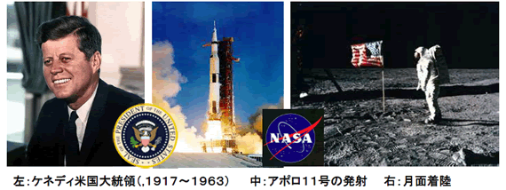 左:ケネディ米国大統領(1917~1963) 中:アポロ11号の発射 右:月面着陸