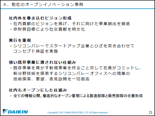 空調・冷凍機事業を中心に海外展開を進め、2兆円を超える売り上げをあげているダイキン工業において、今後、新領域での価値創出を使命とするテクノロジー・イノベーションセンター(TIC)が2015年に設置された。商品開発と技術開発の時間的ミスマッチを克服し、グローバル企業としてのオープンイノベーションを推進する取り組みについて、講演いただいた。